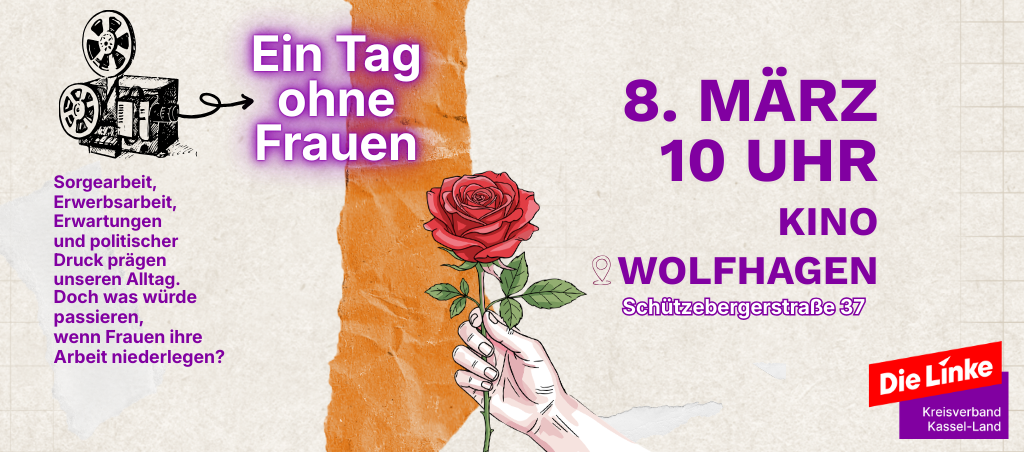 Die Linke Kassel-Land lädt am 8. März zu einer kostenfreien Kinovorstellung unter dem Titel „Ein Tag ohne Frauen“ ins Kino Wolfhagen ein. Im Mittelpunkt steht die Frage, was es für unsere Gesellschaft bedeuten würde, wenn diejenigen, die den Großteil der Sorgearbeit leisten, ihre Arbeit niederlegen. Der Film und die anschließende Austauschrunde machen sichtbar, wie sehr unser Alltag von bezahlter und unbezahlter Arbeit in Familie, Pflege, Betreuung und Beruf getragen wird und wie selten diese Leistungen wirklich anerkannt werden. Kinder sind ausdrücklich willkommen, für Verpflegung ist gesorgt, und im Anschluss gibt es Raum, um ins Gespräch zu kommen, Fragen zu stellen und sich untereinander zu vernetzen. So entsteht im Landkreis ein zusätzlicher Ort, an dem Menschen zusammenkommen können, die Verantwortung tragen, Diskriminierung erfahren und gemeinsam nach Wegen in eine solidarische, gerechte Gesellschaft suchen.
